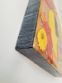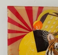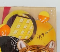 All of my layered mixed-media collage take weeks or months to create, then several months to cure. The surface is easily scratched, so when dusting, always use a soft cloth or compressed air.