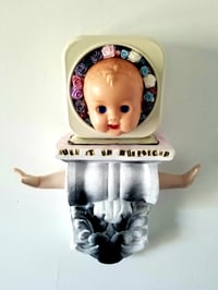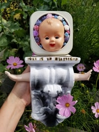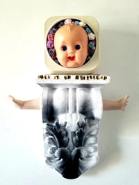 This mixed media assemblage was created with an antique alarm clock body, vintage satin flowers, plaster pedestal, antique doll head, ceramic doll arms, aerosol and acrylic paints, vintage paper.