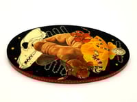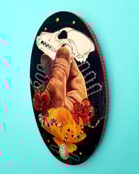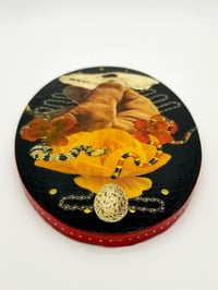 This collage was created with hand-cut vintage paper, acrylic paint, acrylic ink, and upcycled or found supports ( the surface on which they are attached ). Each piece has wire or some other hardware on the back to hang on the wall. Due to differences in monitors, colors may vary slightly from actual collage.